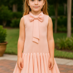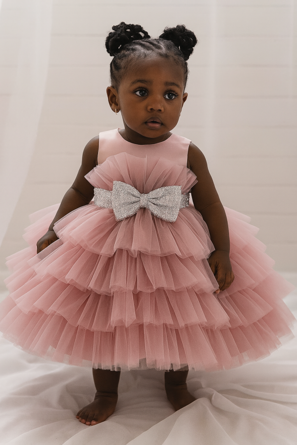 This elegant sleeveless ball gown features layers of soft blue tulle in a tiered ruffle design, creating a full and fluffy silhouette. The dress is beautifully accented with a sparkling silver bow at the waist, adding a touch of charm and glamour. Perfect for birthdays, weddings, photoshoots, or any special occasion, this adorable dress is designed to make your little princess shine with elegance and comfort.